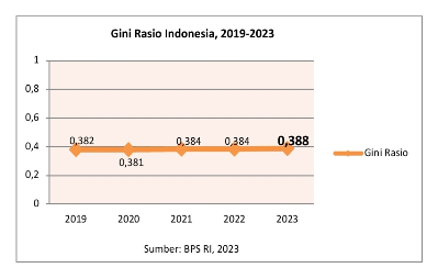 Tercatat di BPS (Badan Pusat Statistik), gini rasio Indonesia per bulan Maret 2022 sebesar 0,384 dan bulan Maret 2023 naik menjadi sebesar 0,388.