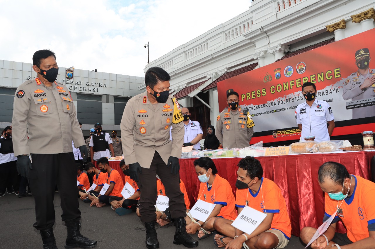Surabaya – Satresnarkoba Polrestabes Surabaya sukses ungkap kasus Narkotika jenis sabu seberat 44,7 kg, pil ekstasi sebanyak 31. 082 butir dan serbuk ektasi sebanyak 1 kg dari 8 orang tersangka. Ungkap kasus bandar narkoba kelas kakap ini dirilis di lapangan utama Mapolrestabes Surabaya, Rabu (29/12/2021) dan mendapat perhatian khusus dari Kapolda Jatim Irjen Pol Nico Afinta.