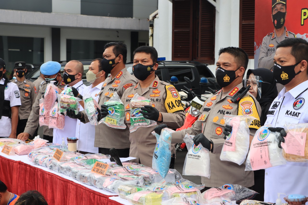 “Dari hasil interogasi dan pengembangan dari ketujuh tersangka yang telah ditangkap sebelumnya, petugas akhirnya berhasil meringkus otak penyalahgunaan narkoba ini inisial SY tanggal 27 Desember 2021 di Rungkut Menanggal Surabaya. Barang bukti narkotika yang diamankan dari tersangka SY yaitu sabu sebanyak 35 bungkus seberat ± 35.254,4 gram beserta bungkusnya, ekstasi sebanyak ± 30.000 butir dan serbuk ekstasi seberat ±1.005 gram beserta bungkusnya,” bebernya.