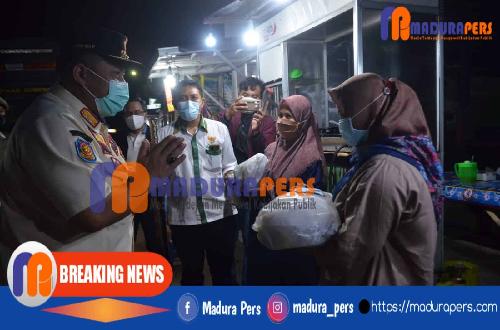 Bantuan berupa paket sembako itu, dibagikan langsung kepada PKL yang sedang berjualan di Pasar Malam, Desa Bangkal, Kecamatan Kota, pada Sabtu (17/07/2021) malam.