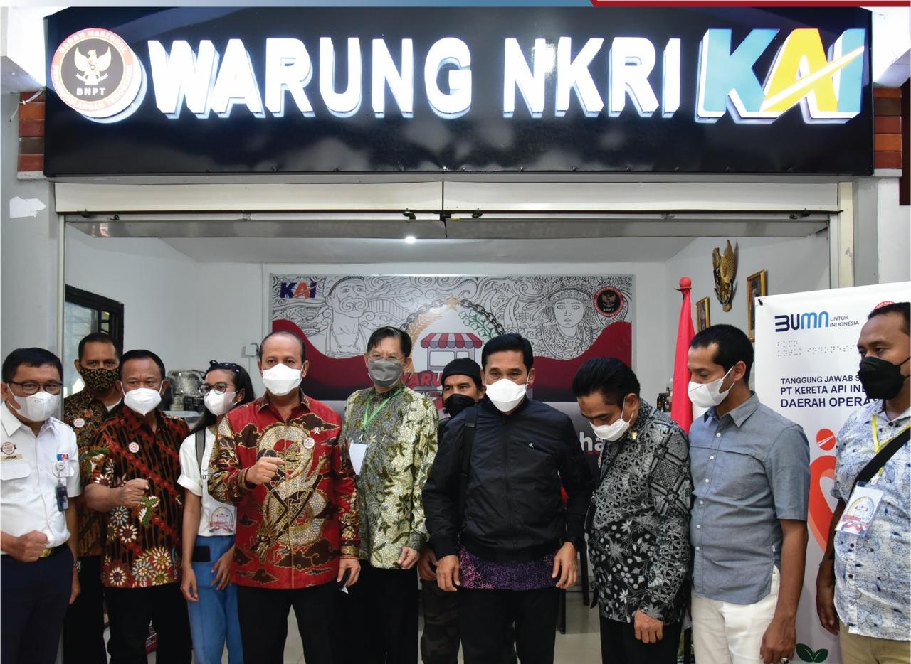 Surabaya – Badan Nasional Penanggulangan Terorisme (BNPT) terus bergerak membina Mitra Deradikalisasi dan Penyintas agar dapat hidup secara layak dan sejahtera. Terbaru, BNPT dan PT Kereta Api Indonesia (KAI) Persero bekerjasama mendirikan tempat berjualan Usaha Mikro, Kecil dan Menengah (UMKM) bagi Mitra Deradikalisasi dan Penyintas bernama Wadah Akur Rukun Usaha Nurani Gelorakan (WARUNG) NKRI di Stasiun Gubeng Surabaya dan Stasiun Malang Kota, Jumat (10/12/2021).