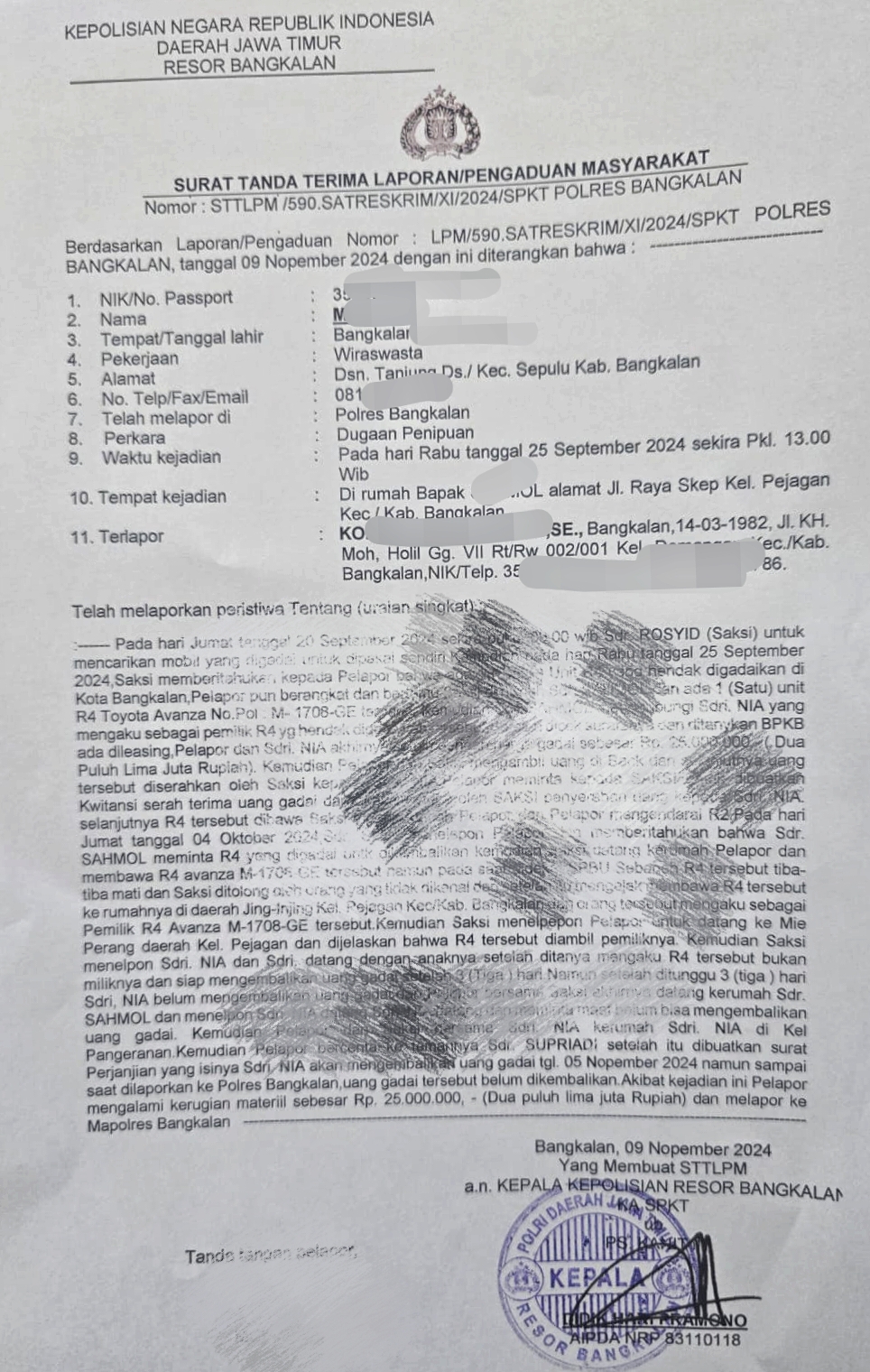 “Atas dasar itu kami membuat laporan ke Polres Bangkalan, dengan tanda terima laporan Nomor : STTLPM/590 SATRESKRIM/XI/2024/SPKT POLRES BANGKALAN, tertanggal 09 November 2024,” cetusnya.