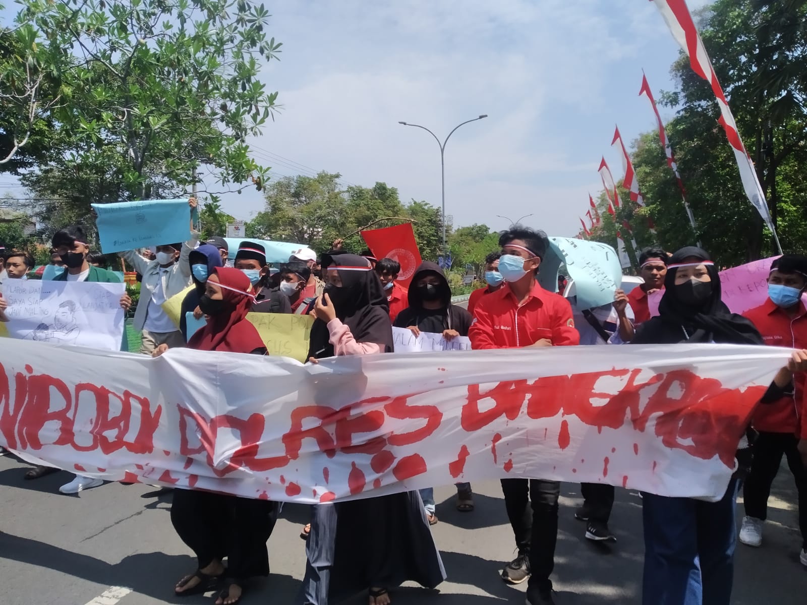 Bangkalan – Puluhan mahasiswa yang tergabung dalam Persatuan Mahasiswa Kokop (PMK) melakukan aksi demonstrasi di depan kantor Mapolres Bangkalan, Madura, Kamis (9/12/2021).