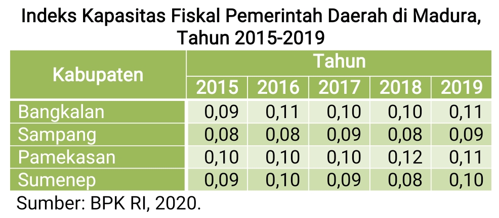 Menurut hasil pemeriksaan BPK RI terhadap kemandirian fiskal Pemda tahun 2018-2019, IKF tahun 2016 Pemda Bangkalan hanya sebesar 0,09, Pemda Sampang 0,08, Pemda Pamekasan 0,10, dan Pemda Sumenep 0,09 dan tahun 2019 IKF Pemda Bangkalan meningkat menjadi 0,11, Pemda Sampang 0,09, Pemda Pamekasan 0,11, dan Pemda Sumenep 0,10.