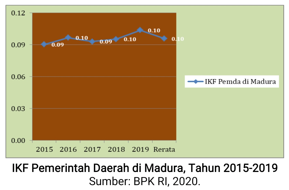Rerata IKF Pemda di Madura selama periode tersebut hanya sebesar 0,10. Tahun 2015 hanya sebesar 0,09, tahun 2016 meningkat menjadi 0,10, tahun 2017 menurun menjadi 0,09, tahun 2018 meningkat menjadi 0,10, dan tahun 2019 konstan 0,10.