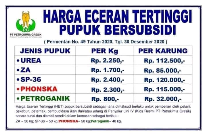 Lebih lanjut, sesuai dengan rincian harga HET pupuk bersubsidi, harga Pupuk Urea sebesar Rp2.250 per kg. Artinya, harga Pupuk Urea Rp112.500 per karung. Sementara, Pupuk NPK harganya Rp2.300 per kg. Artinya, harga Pupuk NPK sebesar Rp115.000 per karung.