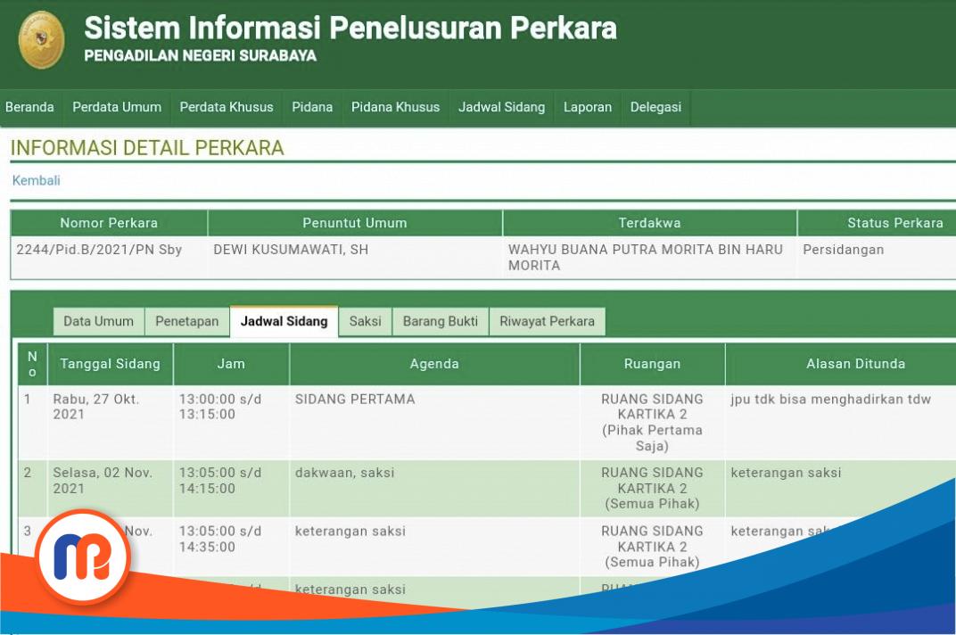 “Jaksa Penuntut Umum (JPU) mengatakan tuntutan belum siap hingga dua kali persidangan di PN Surabaya agenda pembacaan tuntutan, yakni sewaktu sidang pada tanggal 14 Desember 2021 dan 21 Desember 2021,” beber Nelly, Senin (3/1/2022) kepada madurapers.com melalui pesan WhatsApp (WA) sembari mengirimkan tangkapan layar data Sistem Informasi Penelusuran Perkara (SIPP) PN Surabaya yang memuat jadwal sidang perkara tersebut.