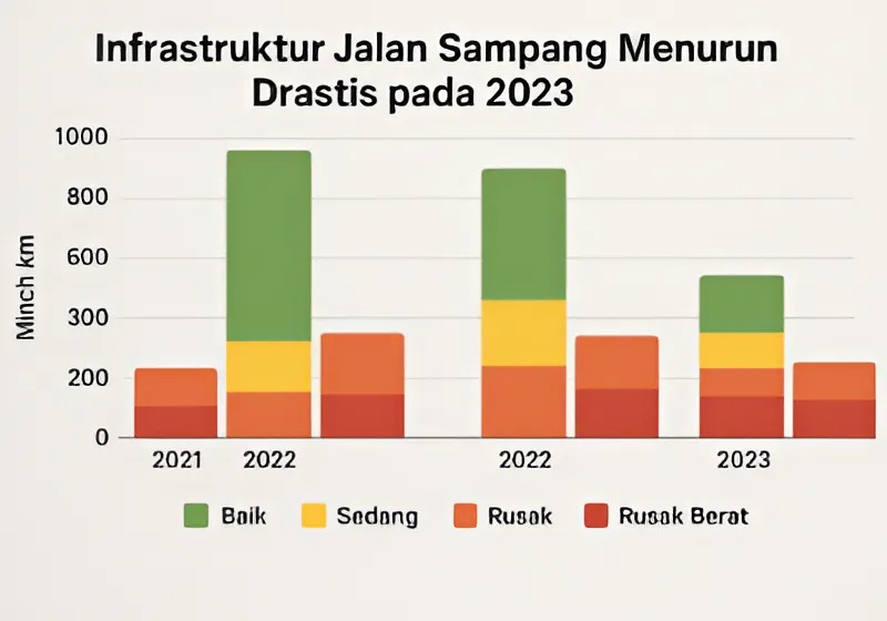 Penurunan jalan dalam kondisi baik secara drastis dari 921,70 km menjadi 567,44 km menandakan penurunan kualitas infrastruktur yang mengkhawatirkan. Meski jalan sedang bertambah, hal ini tidak menggantikan penurunan tajam di kategori jalan baik.