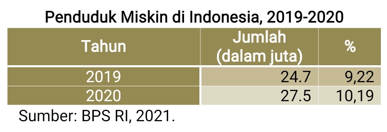 Jakarta – Indonesia belum merdeka dari kemiskinan. Bahkan, di tahun 2020 angkanya semakin meningkat. Peningkatannya 2,7 juta atau 11,15% dari angka kemikinan tahun 2019. Penduduk miskin tahun 2019 sebesar 24,7 juta (9,22%) dan tahun 2020 meningkat menjadi 27,5 juta (10,19%).