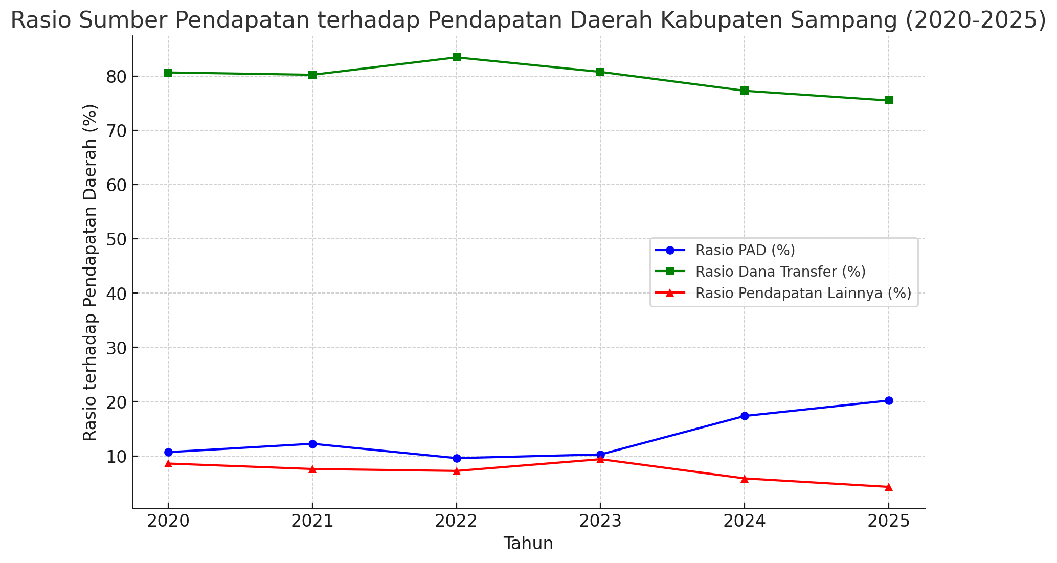 Pada 2025, PAD meningkat tajam menjadi Rp420,25 miliar dengan kontribusi sebesar 20,19 persen. Namun, Dana Transfer masih berperan besar dengan rasio 75,48 persen dari total pendapatan daerah.