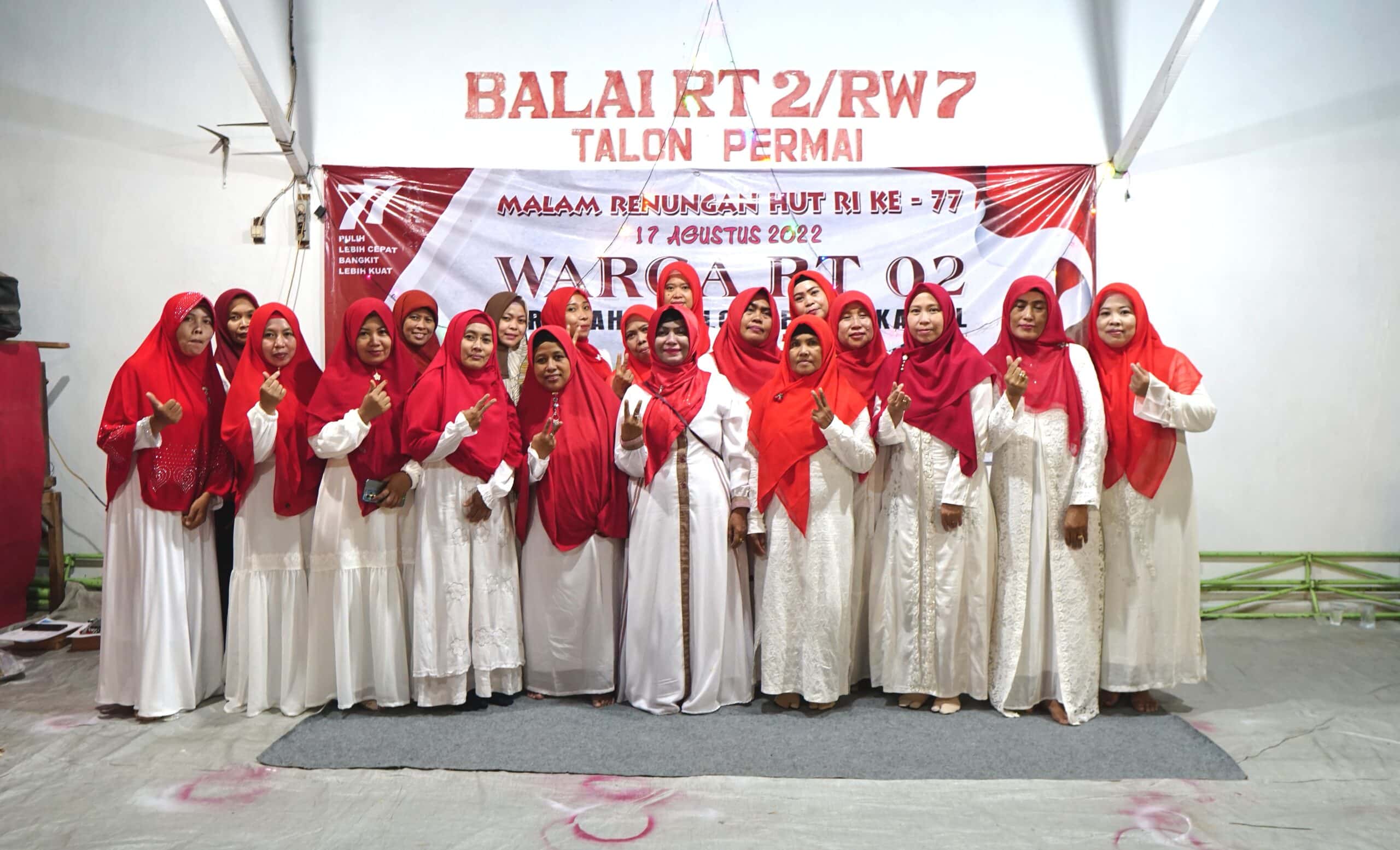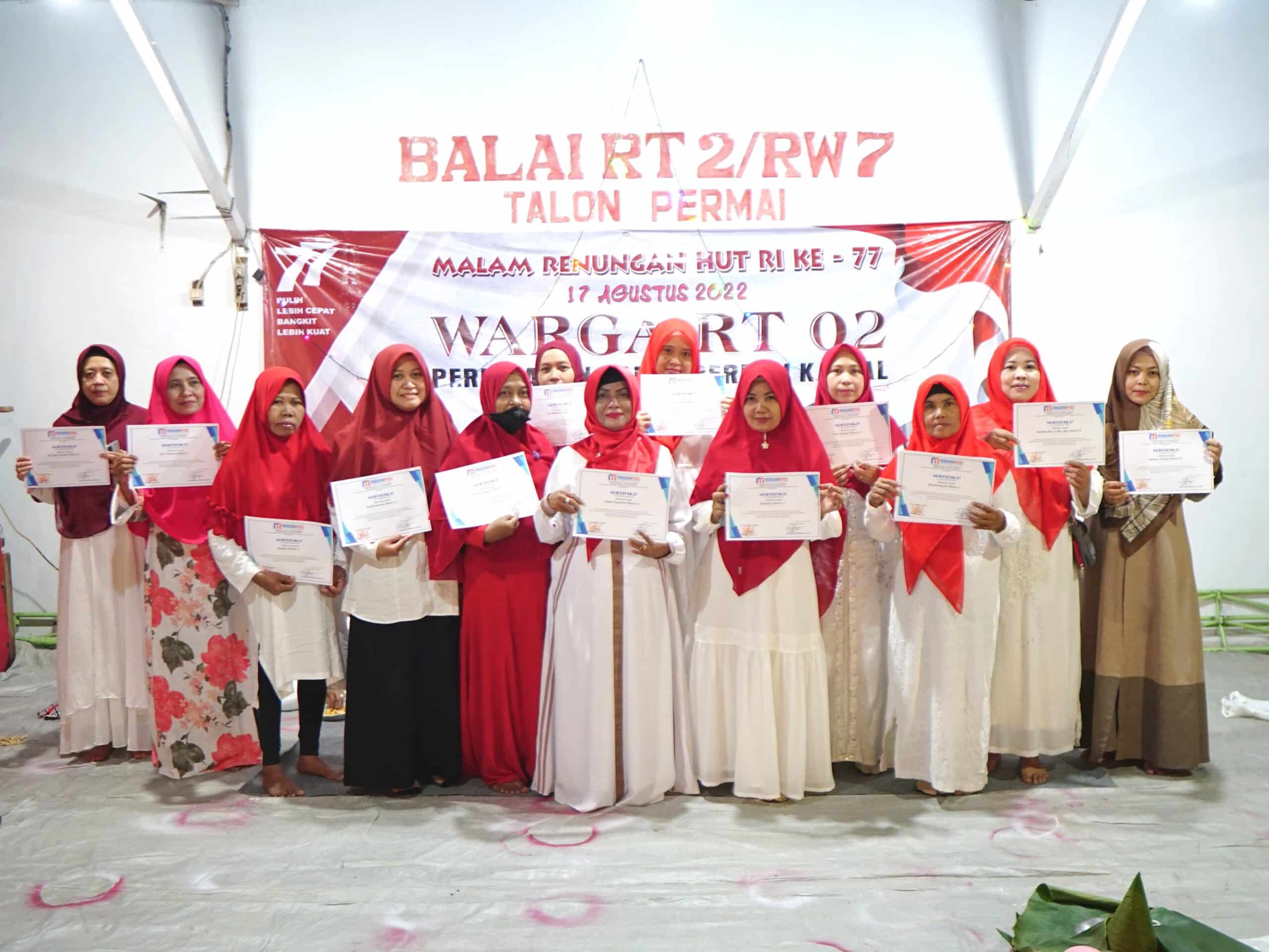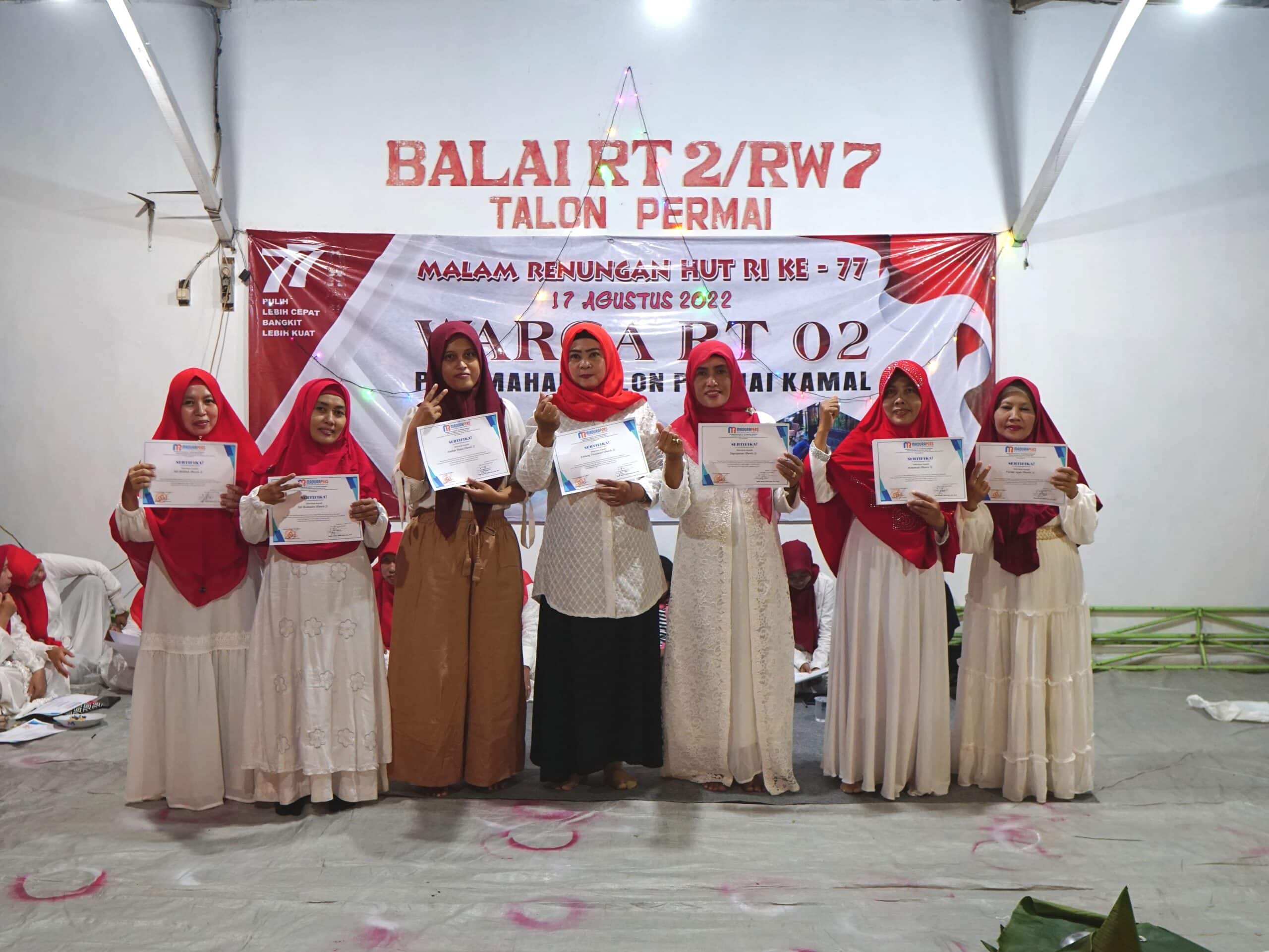 Bangkalan – Dalam rangka menyambut Hari Ulang Tahun (HUT) Republik Indonesia (RI) yang ke77, RT02/RW07 Perumahan Villa Talon Permai, Desa Kamal, Kecamatan kamal Kabupaten Bangkalan menggelar renungan malam sebagai puncak lomba “Kebersihan dan Kreatifitas Lingkungan” dan sekaligus pengumuman pemenang lomba Selasa, (16/08/2022).