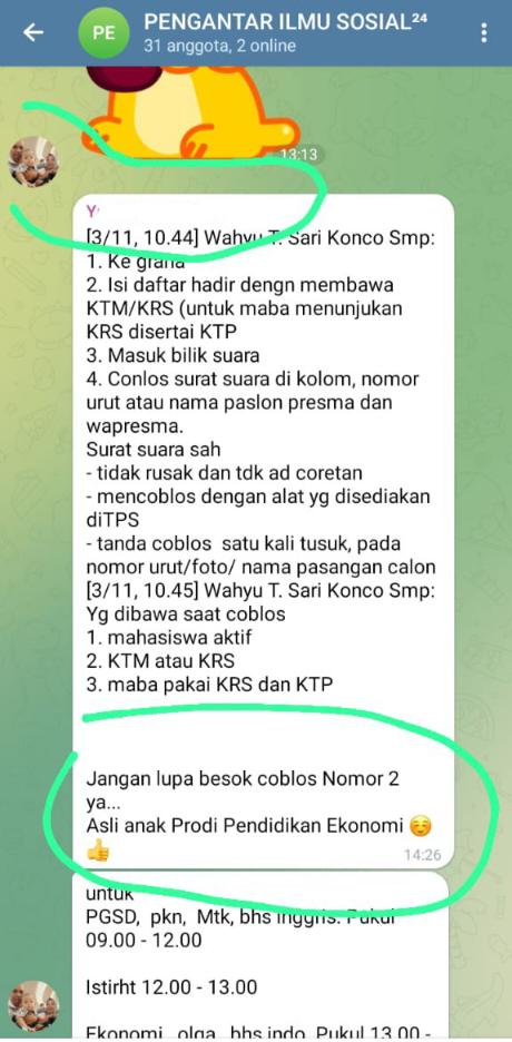 “Jangan lupa besok coblos Pasangan Nomor urut 02 ya, asli anak prodi ekonomi,” keterangannya pada hari Minggu (03/11/2024) Jam 14:00 WIB di grup Pengantar Ilmu Sosial Mahasiswa Angkatan 2024.