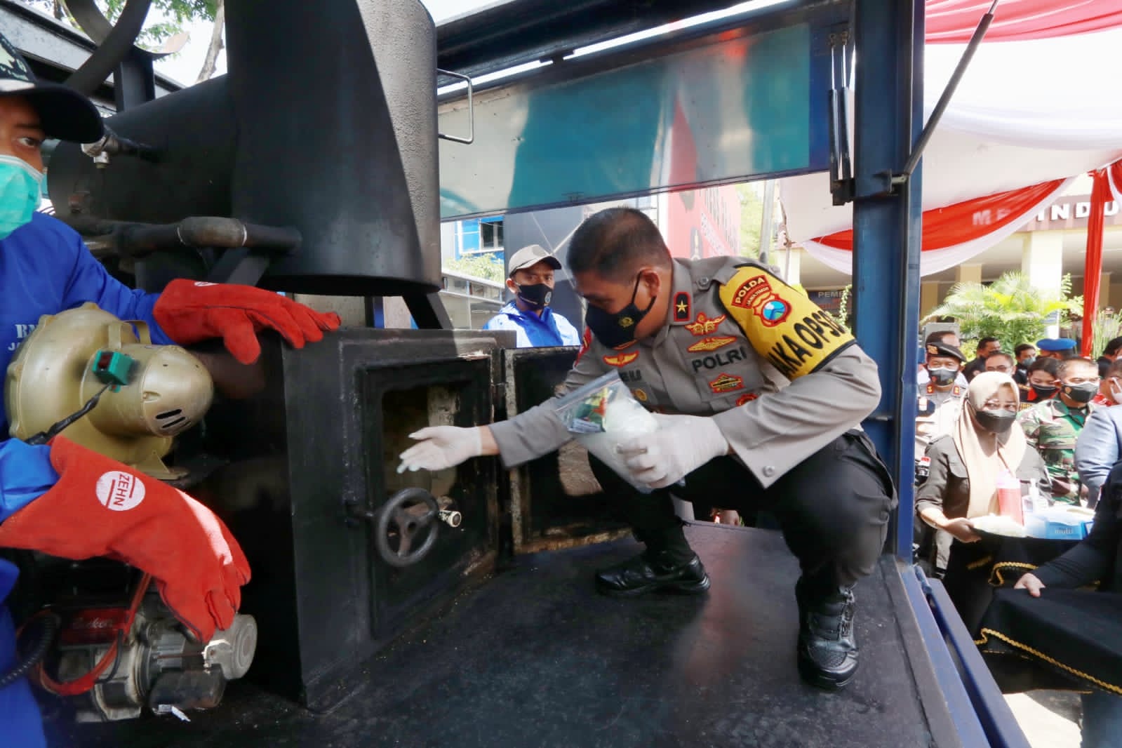Polda Jatim bersama Badan Narkotika Nasional Provinsi (BNNP) Jatim, stakeholder (pemangku kepentingan, red), tokoh agama dan tokoh masyarakat melakukan pemusnahkan barang bukti narkoba dan miras jelang perayaan Nataru di depan parkir PJR Mapolda Jawa Timur. Pemusnahan ini sebagai realisasi tugas Polri dalam pengungkapan kasus narkoba, Kamis (23/12/2021) siang.