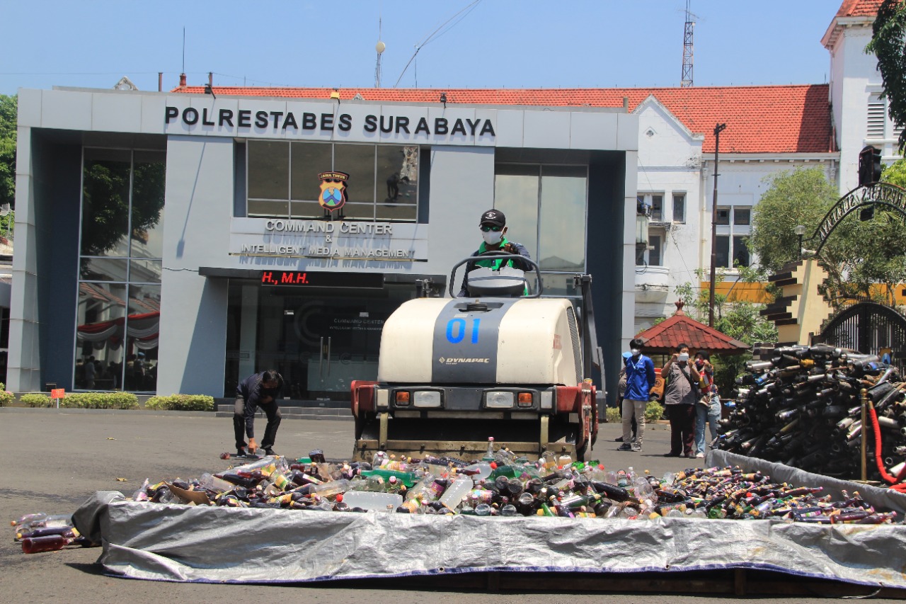 Sementara itu, di hari yang sama Kamis (23/12/2021), Polrestabes Surabaya juga memusnahkan ribuan botol miras dan ratusan knalpot brong hasil tangkapan Operasi Lilin Semeru 2021 di Lapangan Utama Mapolrestabes Surabaya.