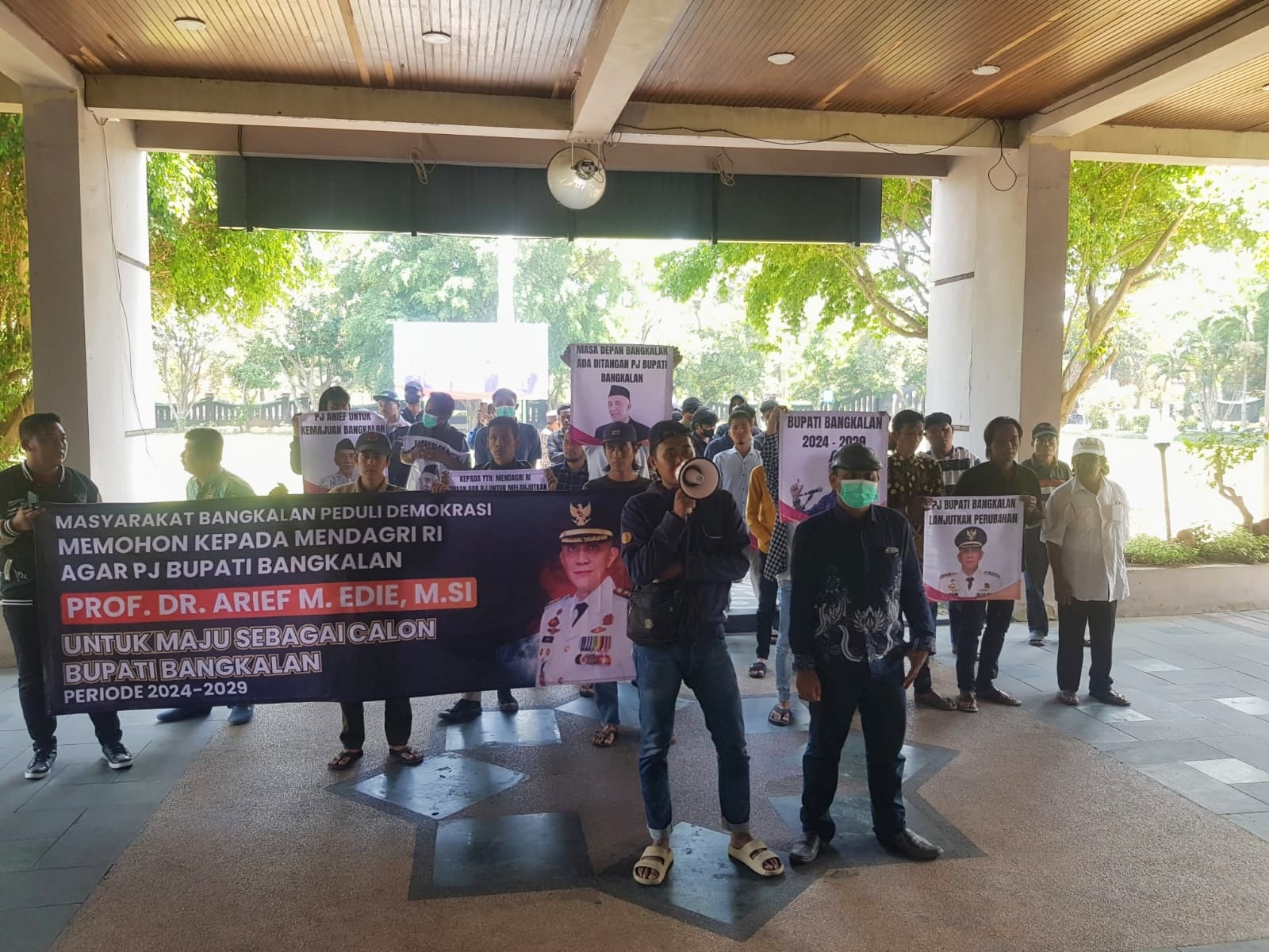 Bangkalan – Puluhan massa yang tergabung dalam Masyarakat Bangkalan Perduli Demokrasi datangi kantor PJ Bupati Bangkalan, Madura, Jawa Timur (Jatim) dalam rangka meminta Pj Bupati, Arief M. Edie, untuk maju Pemilihan Kepala Daera (Pilkada) tahun 2024, Selasa (20/8/2024).