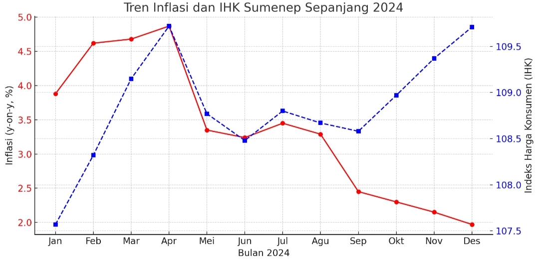 Sumenep – Inflasi di Kabupaten Sumenep sepanjang tahun 2024, berdasarkan data Badan Pusat Statistik (BPS) Sumenep, menunjukkan dinamika yang fluktuatif. Indeks Harga Konsumen (IHK) setiap bulan mencerminkan perubahan harga di berbagai sektor ekonomi.