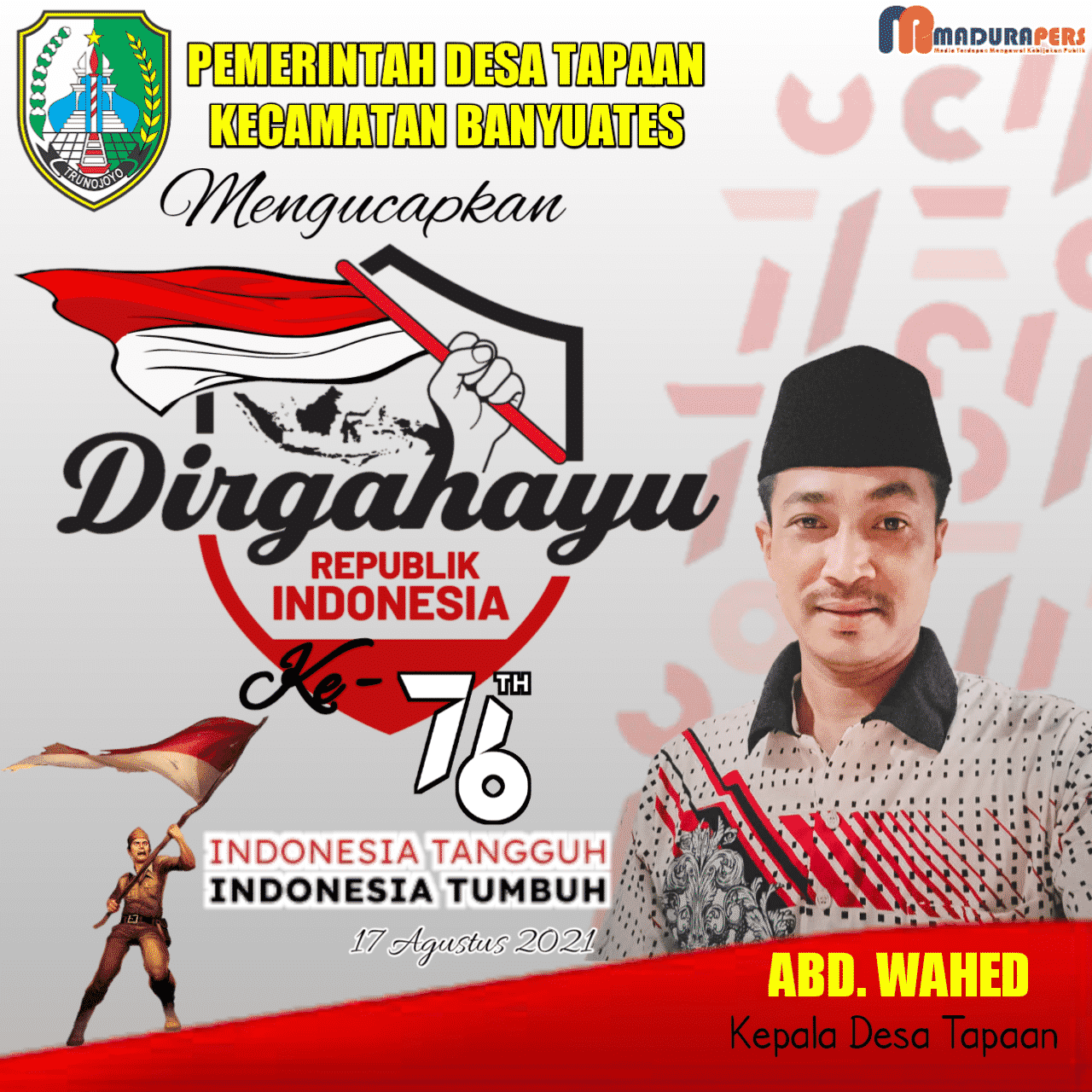 Menjelang hari Proklamasi Kemerdekaan Republik Indonesia yang ke-76 pada tanggal 17 Agustus 2021, Abd. Wahed selaku Kepala Desa Tapaan, Kecamatan Banyuates, Kabupaten Sampang ikut serta mengucapkan Dirgahayu Kemerdekaan Republik Indonesia ke-76.